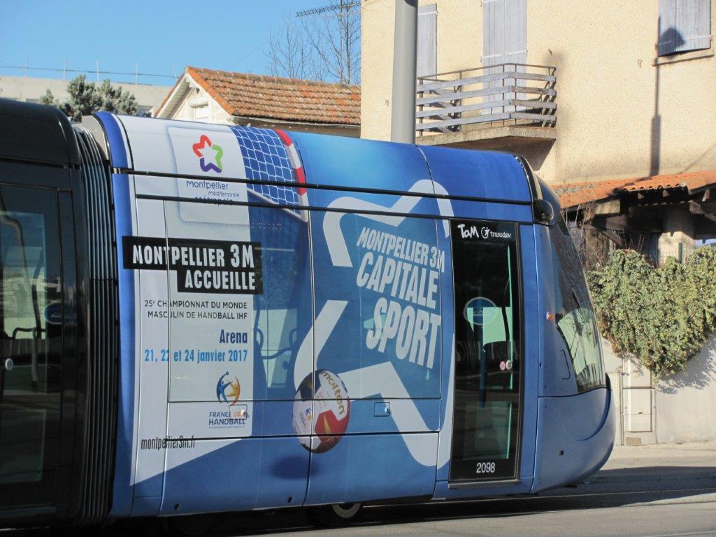 Pelliculage Handball sur un côté d’une motrice de la rame 2098 Citadis 402 Alstom multiligne photographié le samedi 7 janvier 2017. Copyright : Edouard Paris