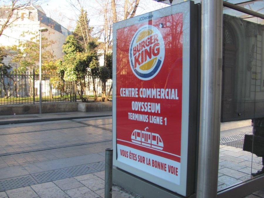Une publicité « Burger King » visible sur le quai direction « Mosson » de la ligne 1, station « Gare Saint-Roch », rue Maguelone à Montpellier, le samedi 7 janvier 2017. Copyright : Edouard Paris