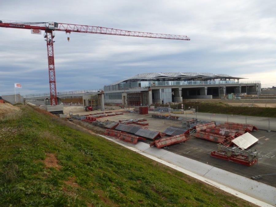 Photo de l’avancement du chantier de construction de la gare TGV Montpellier Sud de France et de celui de l’ouvrage d’art au-dessus de la future section d’autoroute A9, le dimanche 8 janvier 2017. Copyright : Michel Bozzola