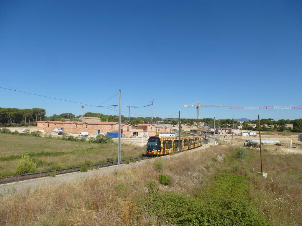 La rame 2094 Citadis 402 Alstom est photographiée sur la ligne à voie unique de la ligne 2 qui traverse le chantier de l’éco quartier du Domaine de Caylus, le mardi 19 juillet 2016. Copyright : Louis Ferdinand