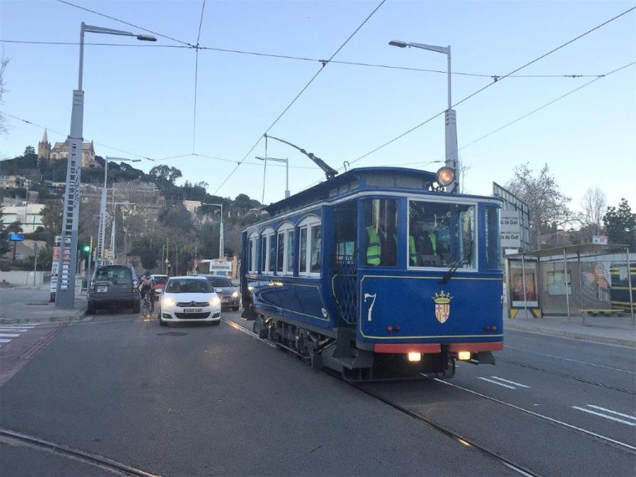 La motrice n°7 du Tramway Bleu de Barcelone est photographiée sur l’avenue du Tibidabo à la hauteur de la rue de Bosch i Alsina, alors qu’elle se dirige vers la place Kennedy, le samedi 14 janvier 2017 en fin d’après-midi. Copyright : LauDel