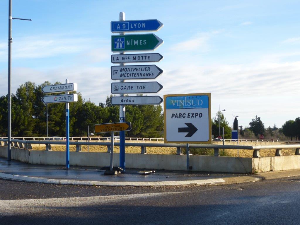 Panneau directionnel « Gare TGV » visible sur le rond-point du Zénith à Montpellier, le cinquième en partant du haut. Photo prise le dimanche 29 janvier 2017. Copyright : Michel Bozzola