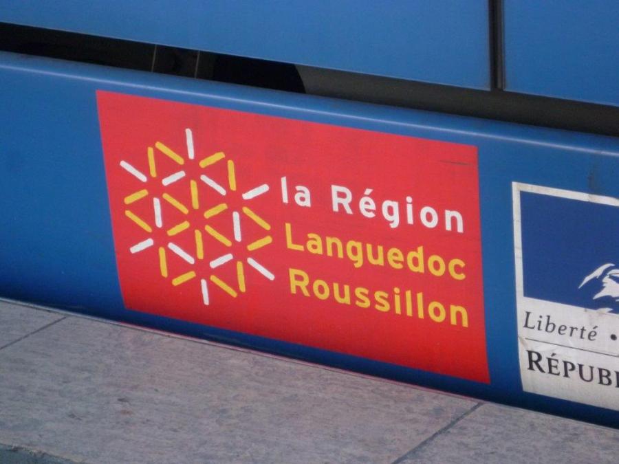 Le logo la Région Languedoc Roussillon, qui enlaidit la plupart des rames du tramway de Montpellier, photographié le samedi 4 février 2016. Copyright : Edouard Paris