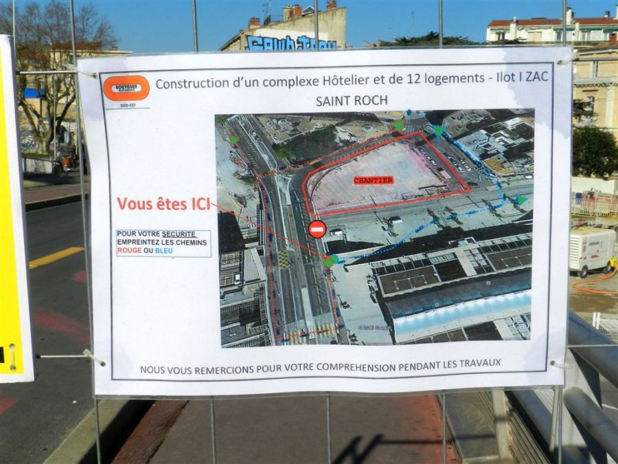 Autre schéma de cheminement piéton, chantier du complexe architectural « Hôtel St-Roch – Belaroia » oblige. Photo prise le vendredi 17 février 2017. Copyright : Anje34