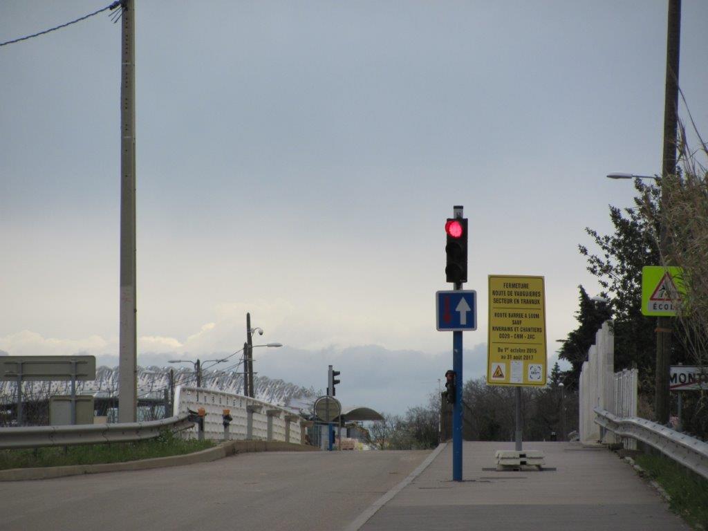 Côté Odysseum, la circulation des véhicules automobiles sur l’ouvrage d’art surplombant l’actuelle autoroute A9 se fait de façon alternée. Photo prise le samedi 4 mars 2017. Copyright : Edouard Paris