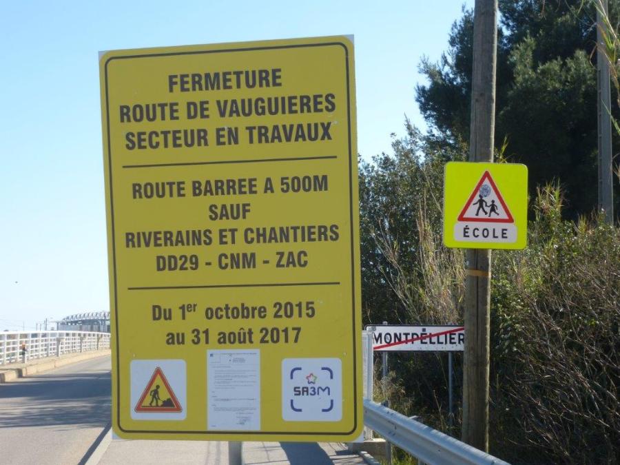 Panneau de limitation de circulation installé côté Odysseum à Montpellier, photographié le dimanche 26 février 2017. Copyright : Michel Bozzola