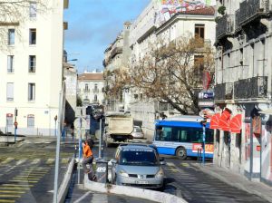 - Un semi-remorque tourne pour emprunter la rue Pagézy à Montpellier à l’approche du chantier « Hôtel St-Roch – Belaroia », le lundi 6 mars 2017. Copyright : Anje34