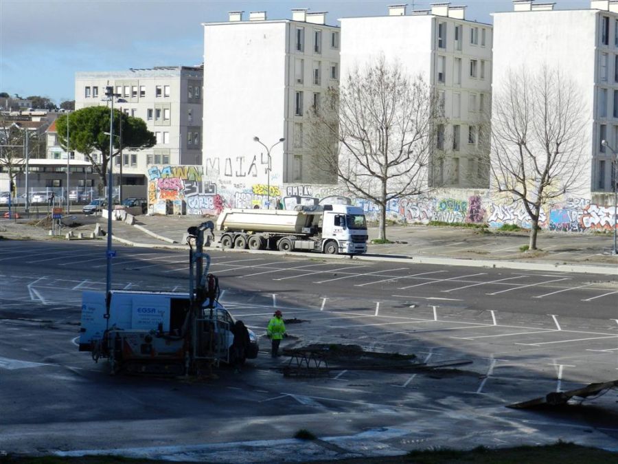 Après avoir quitté la rue Catalan, un semi-remorque emprunte l’ancien parking de surface de la gare de Montpellier Saint-Roch en direction du chantier « Hôtel St-Roch – Belaroia », le lundi 6 mars 2017. Copyright : Anje34