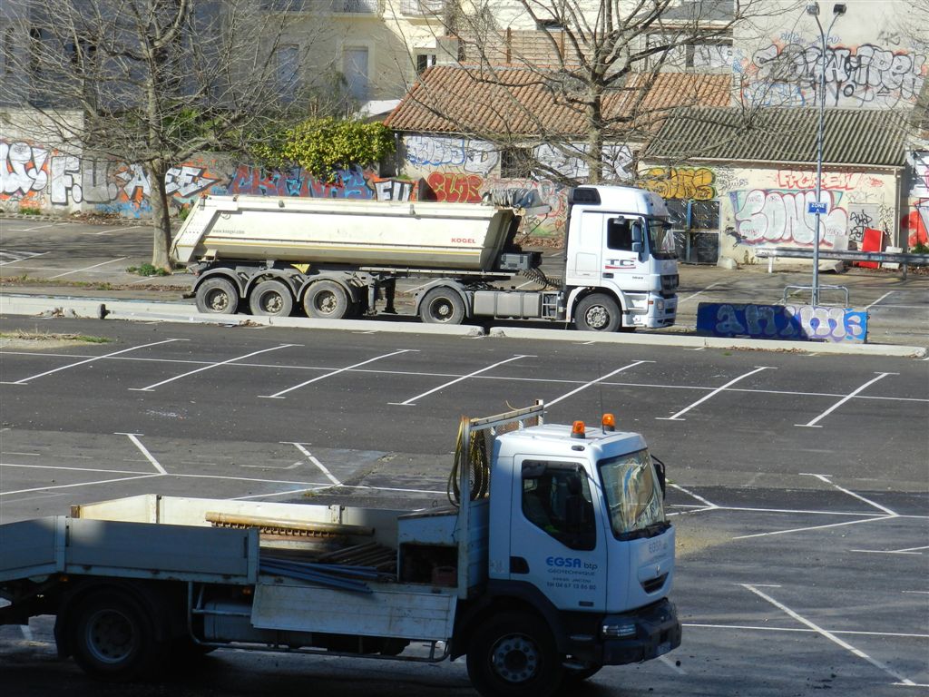 Un semi-remorque est photographié sur l’ancien parking de surface de la gare de Montpellier Saint-Roch alors qu’il circule en direction du chantier « Hôtel St-Roch – Belaroia », le lundi 6 mars 2017. Copyright : Anje34