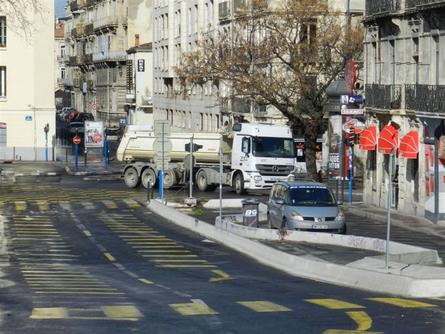 Un semi-remorque emprunte la partie sud-est de la rue du Grand Saint-Jean à Montpellier en direction du chantier « Hôtel St-Roch – Belaroia », le lundi 6 mars 2017. Copyright : Anje34