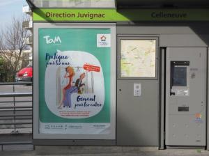 - Une des affiches de la campagne institutionnelle contre les incivilités dans les transports photographiée à la station « Celleneuve » de la ligne 3, quai direction « Juvignac », le samedi 18 mars 2017. Copyright : Edouard Paris