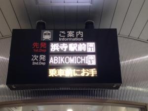 - A Osaka, au terminus « Tennōji-Ekimae » (HN01), un tableau électronique d’information indique que le prochain tram va partir en direction du terminus « Hamadera-Ekimae » (HN31). Photo prise le samedi 18 mars 2017. Copyright : Karine D