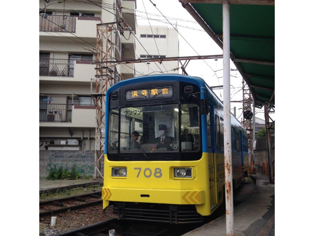 A Osaka, la motrice 708 est photographiée à la station « Sumiyoshi » (HN10) » au sud de la branche « Hankai Uemachi Line », le samedi 18 mars 2017. Copyright : Karine D
