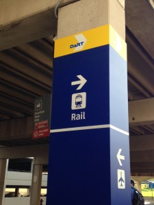 - Signalétique indiquant la direction de la station « DFW Airport » du réseau DART photographiée dans le terminal A de l’aéroport international de Dallas Fort Worth, le mercredi 22 mars 2017. Copyright : Karine D
