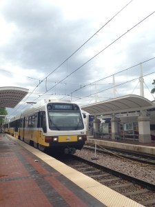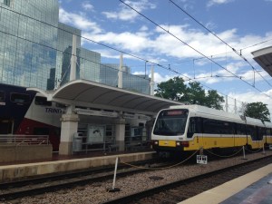 - A Dallas, à la station « Union Station », commune aux lignes rouge et bleue du réseau LRV DART de Dallas, les rames Kinki Sharyo sont en correspondance avec les trains de la ligne » Trinity Railway Express » faisant également partie du réseau DART. Photo prise le vendredi 24 mars 2017. Copyright : Karine D