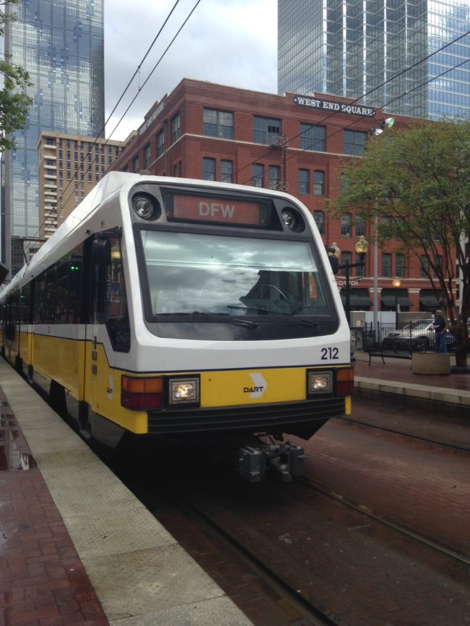 A Dallas, sur Pacific Avenue, une composition de rames SLRV Kinki Sharyo, 212 en tête, va quitter la station « West End » en direction du terminus « DFW Airport » de la ligne orange, le vendredi 24 mars 2017. Coyright : Karine D