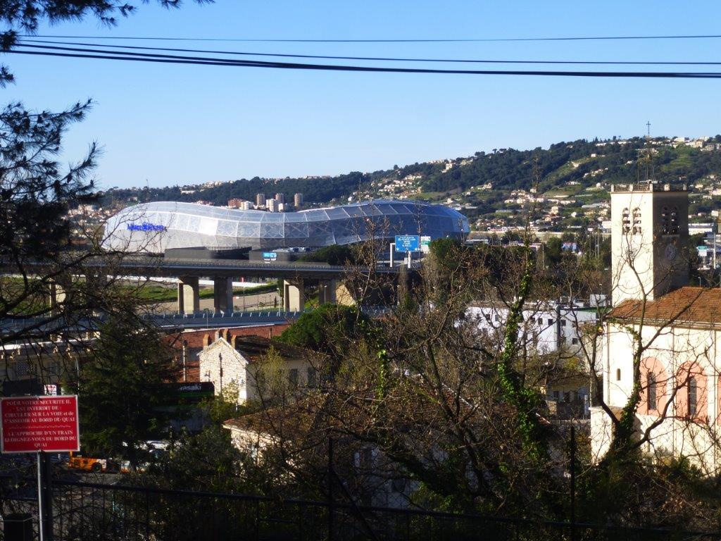 Le célèbre Stade Allianz Riviera de Nice photographié depuis un autorail des Chemins de fer de Provence en route pour Digne à la hauteur de la halte Saint-Isidore, le dimanche 26 mars 2017. Copyright : Michel Bozzola