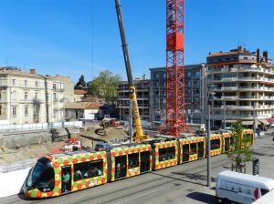 - La rame 2094 Citadis 402 Alstom, opérant sur la ligne 2, passe à la hauteur du chantier « Hôtel St-Roch – Belaroia », le jeudi 30 mars 2017. Copyright : Anje34