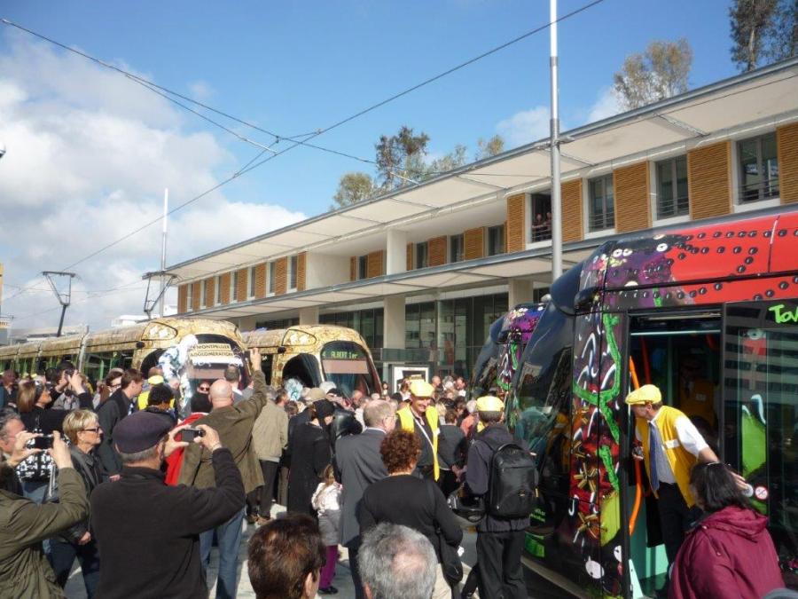A la station « Georges Frêche – Hôtel de Ville » à Montpellier, les appareils photo numériques sont de sortie, le vendredi 6 avril 2012, jour de l’inauguration des lignes 3 et 4 de tramway. Copyright : Louis Ferdinand