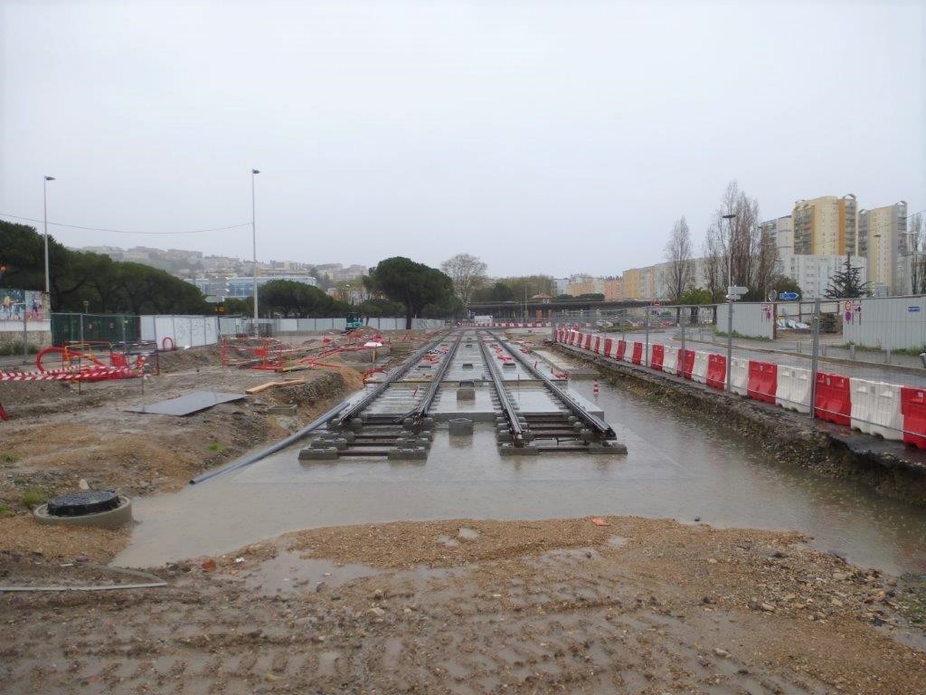 A Nice, les premières voies du T2 ont été posées à la hauteur du futur terminus nord-ouest « Nikaia – Cadam » à la mi-décembre 2016. Photo prise le samedi 25 mars 2017. Copyright : Michel Bozzola
