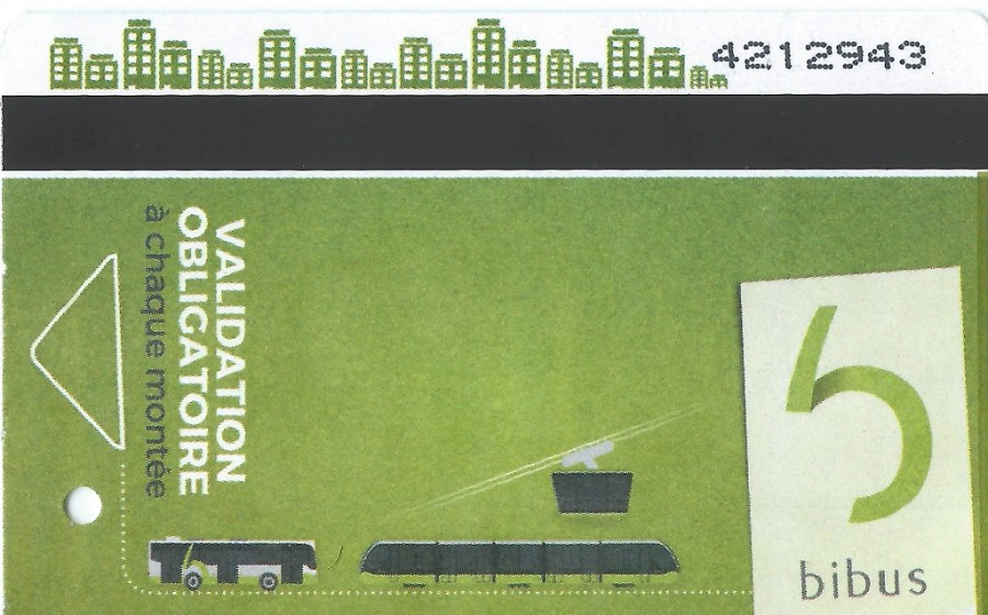 Ticket magnétique bus, tramway et téléphérique du réseau bibus à Brest. Scan du ticket 1 jour acheté par le webmestre le 22 avril 2017