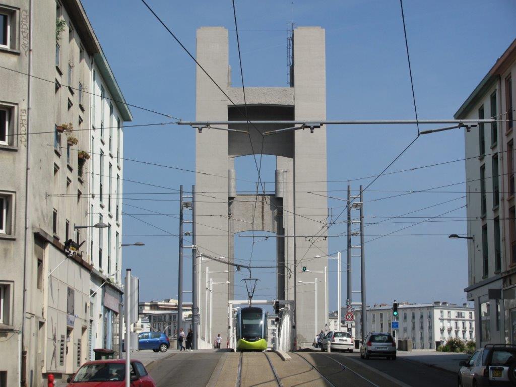 A Brest, la rame 1011 Citadis 302 Alstom franchit le pont de Recouvrance en direction du terminus ouest « Porte de Plouzané », le samedi 22 avril 2017. Copyright : Edouard Paris