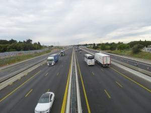 - Photographie des voies de la nouvelle section d’autoroute A9 au centre et des voies de l’A709 sur chaque côté depuis le pont de la route de Sète à Saint-Jean-de-Védas, le mercredi 26 avril 2017. Vue en direction de l’est. Copyright : Michel Bozzola