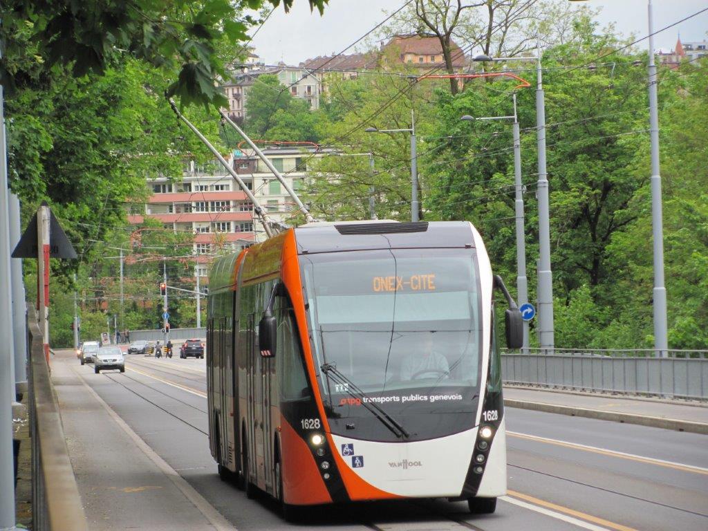 Le trolleybus articulé 1628 VanHool Exqui.City 18T/AG300-TRL-T Van Hool est photographié dans la montée de la route de Chancy, côté Grand-Lancy, le dimanche 7 mai 2017. Copyright : Edouard Paris