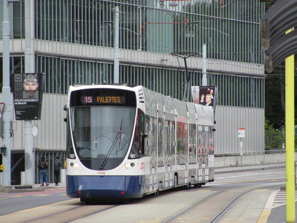 La rame 1822 Tango Stadler est photographiée avenue de France à Genève, entre le terminus « Nations » et la station « Sismondi », ligne 15, le dimanche 7 mai 2017. Copyright : Edouard Paris