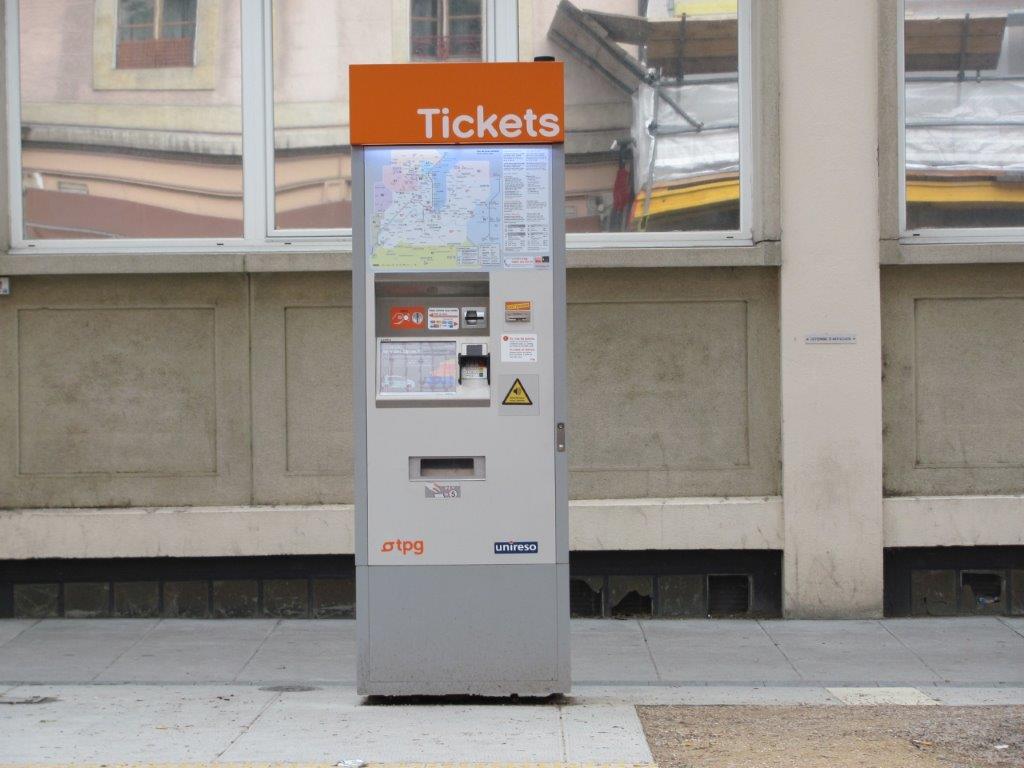Distributeur automatique de titres de transport unireso – tpg photographié sur un quai de la station « Blanche », rue de Carouge à Genève, le dimanche 7 mai 2017. Copyright : Edouard Paris