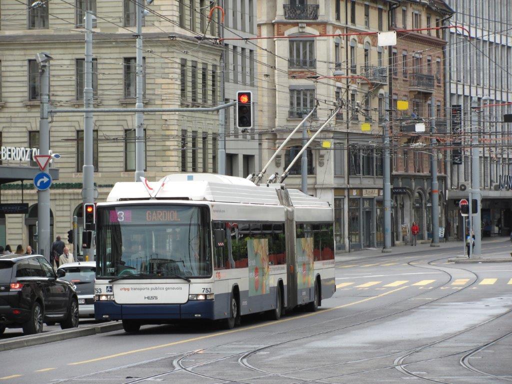 Le trolleybus articulé 753 BGT-N2C Swisstrolley 3 Hess/Kiepe, opérant sur la ligne 3, est photographié place de Cornavin à Genève, le lundi 8 mai 2017. Copyright : Edouard Paris