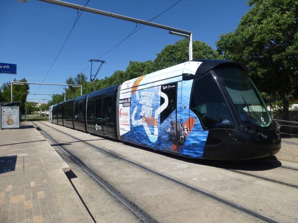 A Montpellier, exemple d’un pelliculage partiel appliqué sur la rame 2099 Citadis 402 Alstom photographiée à la station « Château d’Ô » de la ligne 1, le lundi 15 mai 2017. Copyright : Louis Ferdinand
