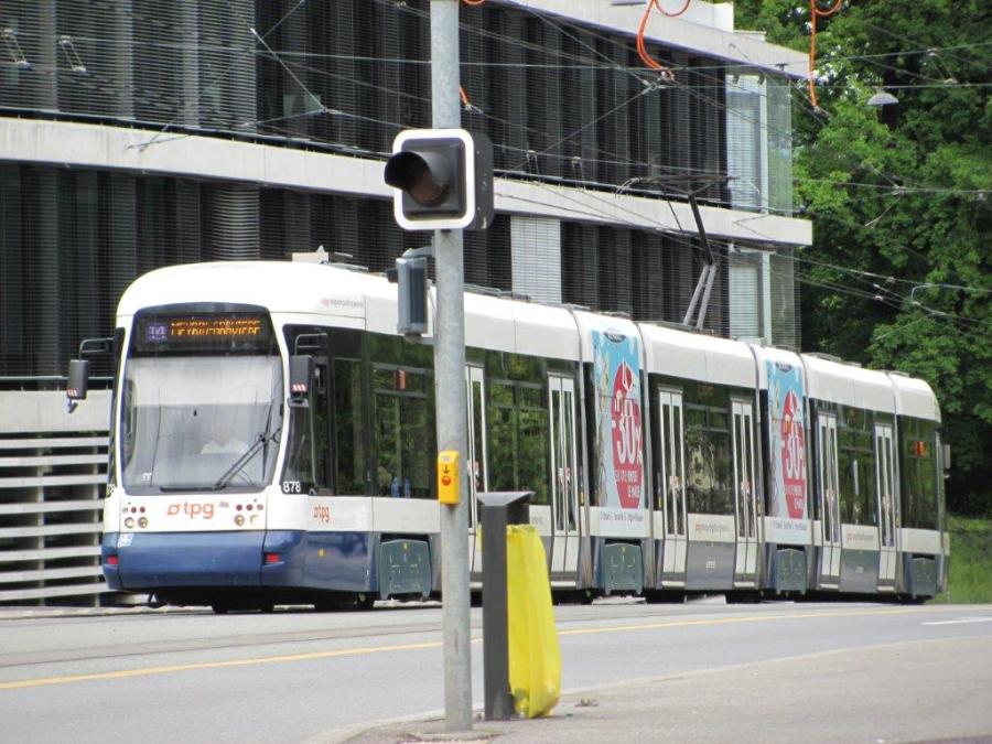 A Genève, exemple d’un pelliculage partiel appliqué sur la rame 878 Cityrunner Bombardier photographiée à proximité de la station « Bouchet » commune aux lignes 14 et 18, le dimanche 7 mai 2017. Copyright : Edouard Paris