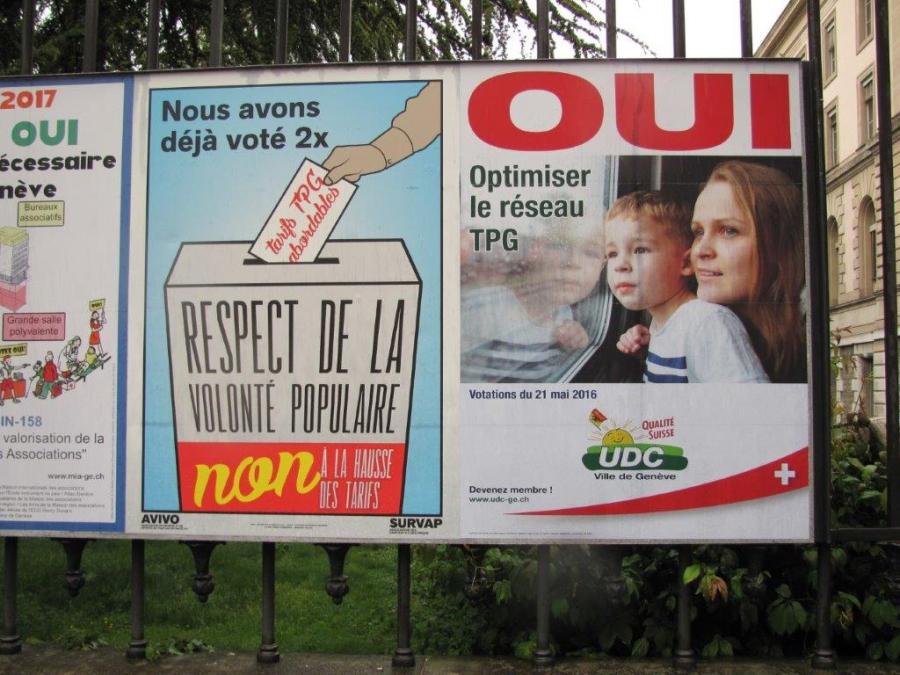 Échantillon d’affiches sur la question de la hausse des tarifs Unireso soumise au vote des citoyennes et citoyens de la République et canton de Genève, le dimanche 21 mai 2017. Photo prise le samedi 6 mai 2017. Copyright : Edouard Paris