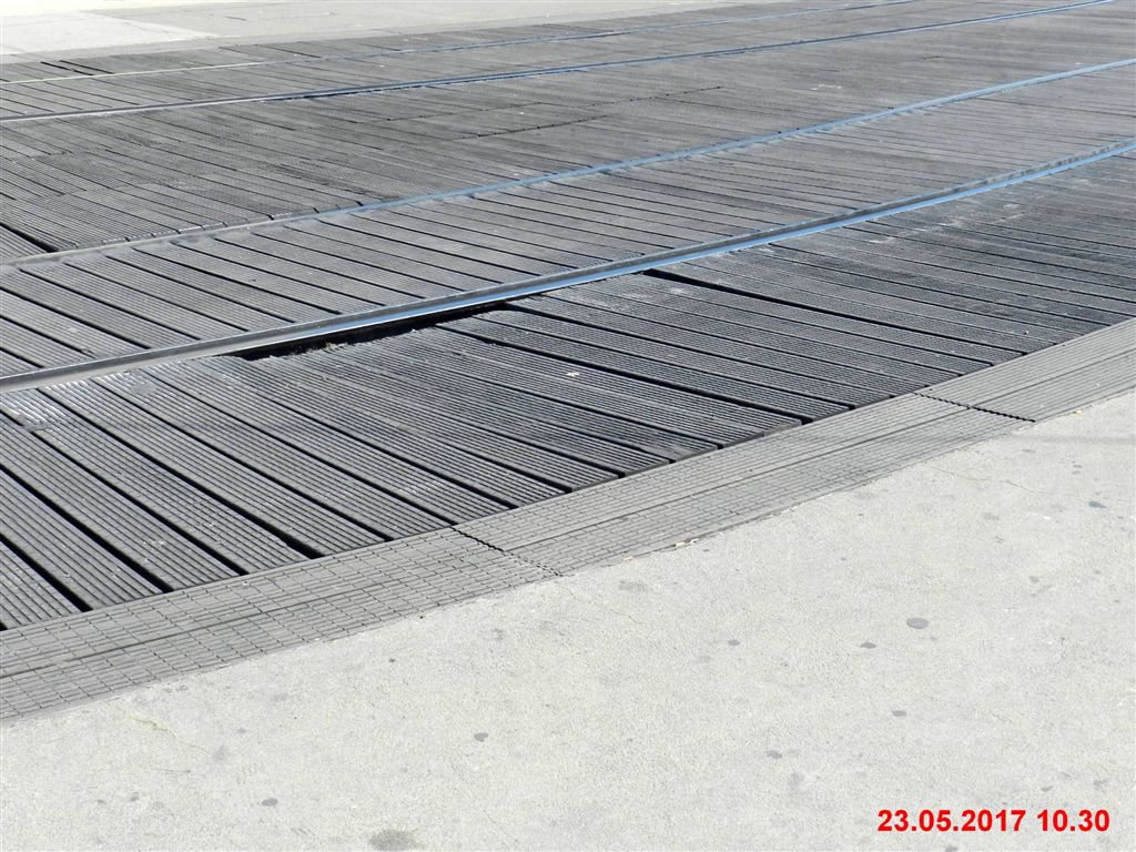 Gros plan sur l’affaissement des lattes de bois de la plateforme du tramway entre le Pont-de-Lattes et la station « Du Guesclin » de la ligne 1, le mardi 23 mai 2017. Copyright : Anje34