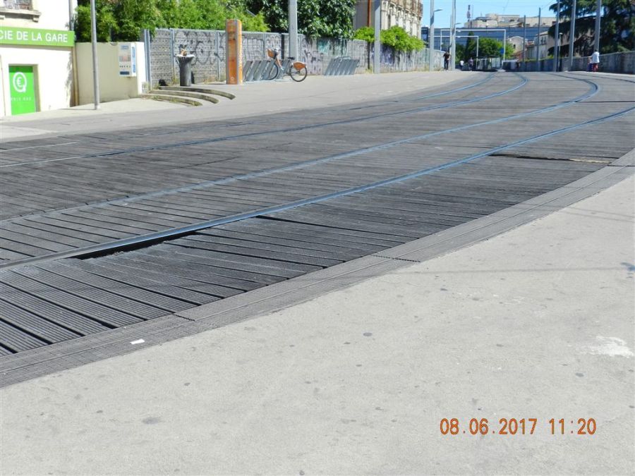 Aperçu de la plateforme du tramway entre le Pont-de-Lattes et la station « Du Guesclin » de la ligne 1, le jeudi 8 juin 2017. Copyright : Anje34