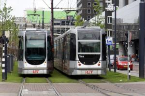 - Les rames Citadis 302 Alstom 2146 et 2059 se croisent à la hauteur de Delftseplein (place de Delft) à Rotterdam, le dimanche 7 mai 2017. Copyright : Yvon Brument