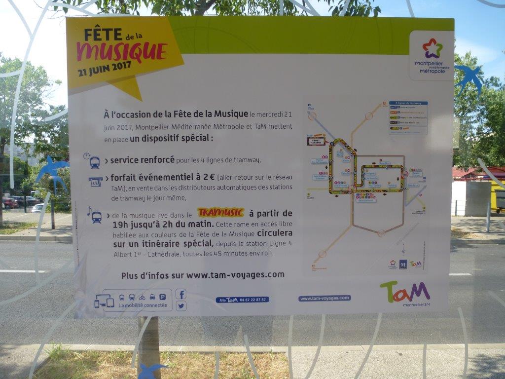 Affichage informatif spécial Fête de la Musique et TraMusic à la station « Saint-Paul » de la ligne 1 de tramway à Montpellier, le vendredi 16 juin 2017. Copyright : Louis Ferdinand