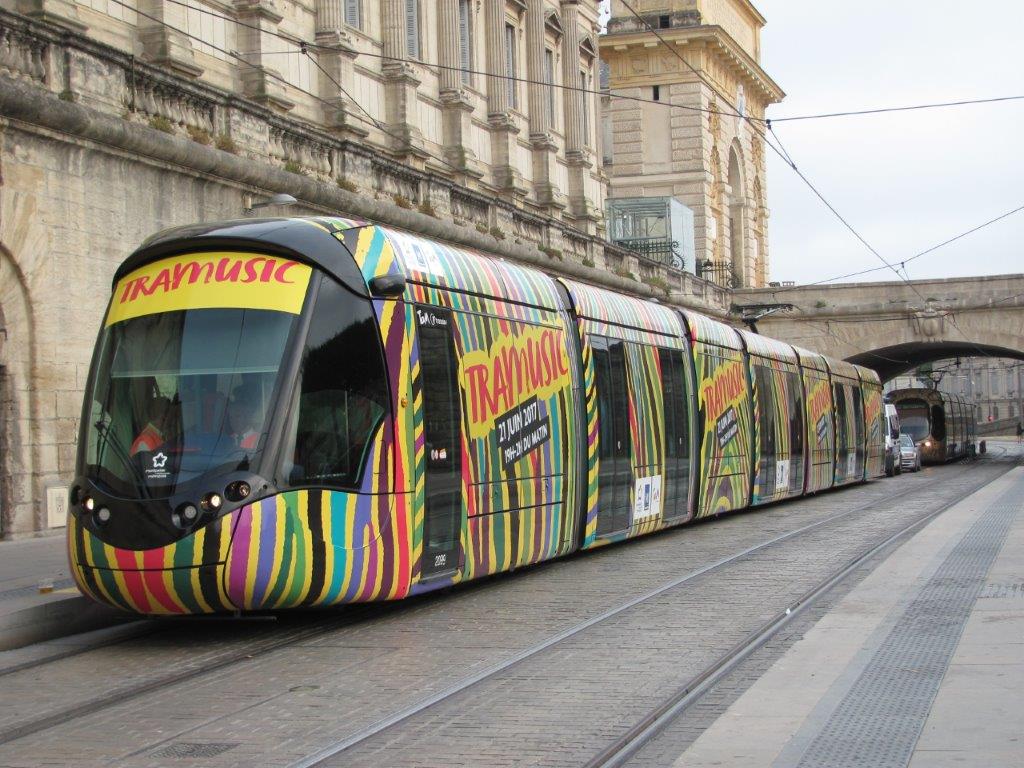La rame 2099 Citadis 402 Alstom multiligne TraMusic est photographiée à la station « Peyrou – Arc de Triomphe », quai 4a, alors qu’elle est sur le point de terminer sa première boucle entamée avec dix minutes d’avance, le mercredi 21 juin 2017. Copyright : Edouard Paris