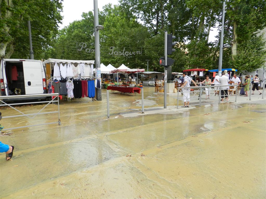 Le marché du parc Tastavin à Montpellier les pieds dans l’eau à la suite d’une rupture d’une canalisation d’eau potable survenue le jeudi matin 22 juin 2017. Copyright : Anje34
