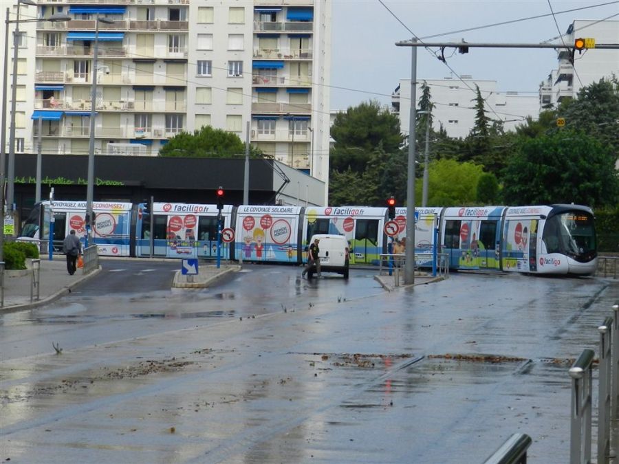 La rame 2098 Citadis 402 Alstom aux couleurs de la start-up Faciligo photographiée après son passage sur la plateforme inondée du boulevard Pedro-de-Luna à Montpellier, le jeudi matin 22 juin 2017. Copyright : Anje34