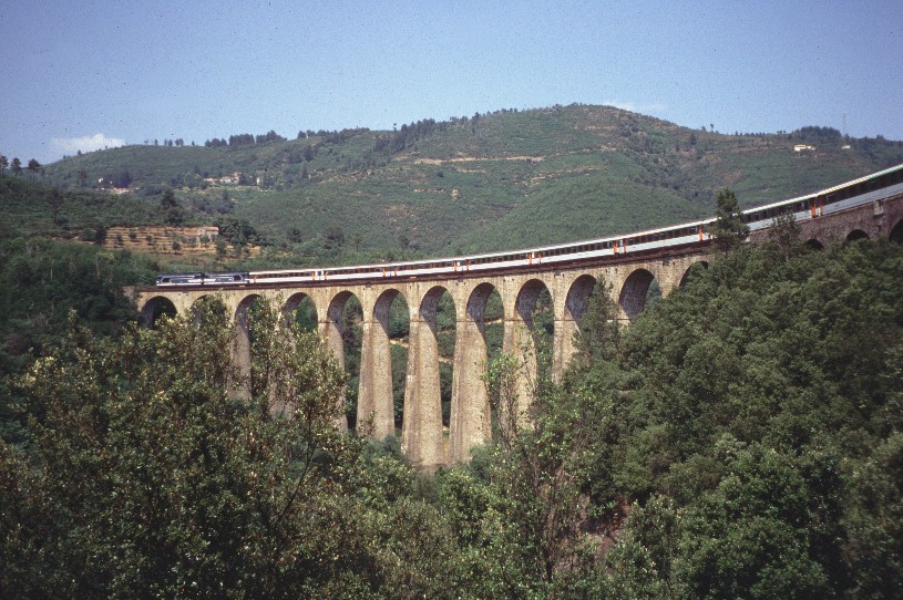 Double traction diesel sur le train « Le Cévenol » photographié au moment où il franchit le viaduc de Chamborigaud, le samedi 1er juillet 1995. Copyright : Edouard Paris