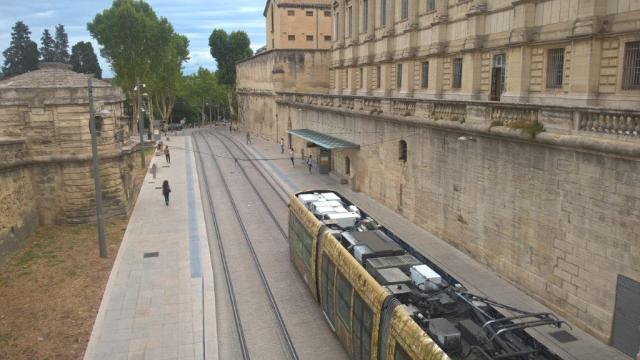 Le mercredi 28 juin 2017 à 12h29, la rame 2031 Citadis 302 Alstom, circulant dans le sens 4a, va s’arrêter à la station « Peyrou – Arc de Triomphe » où trois personnes monteront à bord. Copyright : Edouard Paris