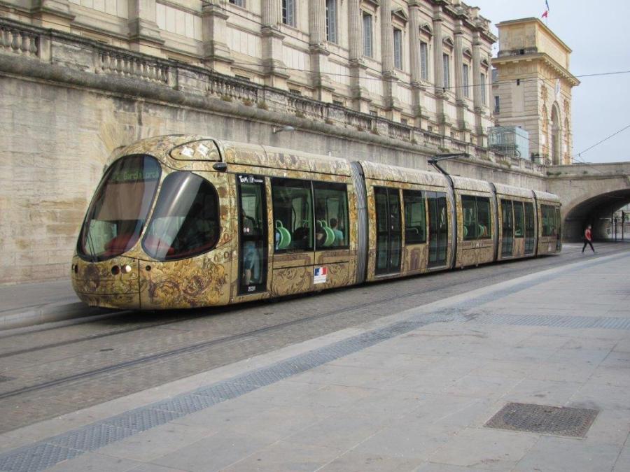 Pas grand monde dans la rame 2031 Citadis 302 Alstom photographiée le mercredi 21 juin 2017 à 18h44, jour de la Fête de la Musique, alors qu’elle marque l’arrêt à la station « Peyrou – Arc de Triomphe » de la ligne 4, quai 4a. Copyright : Edouard Paris