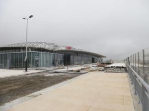 - Sur le parvis supérieur en travaux de la future gare TGV Montpellier Sud de France rien ne laisse supposer que le terminus de la ligne 1 de tramway prolongée se situera à cet endroit. Photo prise le dimanche 9 juillet 2017. Copyright : Michel Bozzola