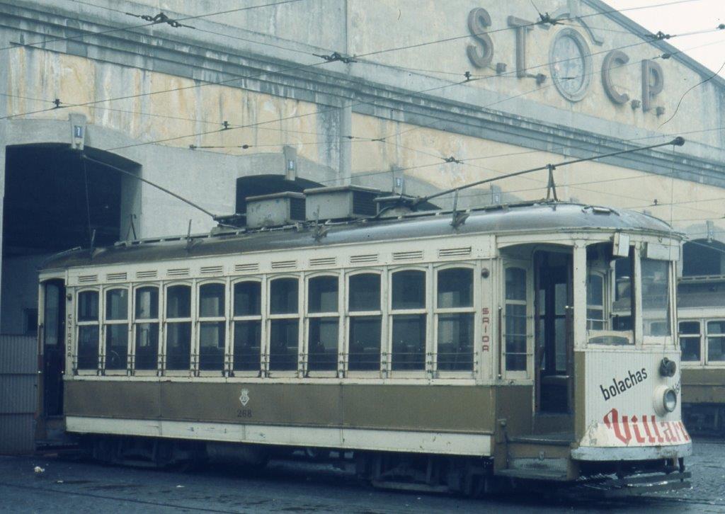 A Porto, la motrice 268 de type Bogie Fumista (année 1930) est photographiée dans l’enceinte du dépôt STCP de Boavista au mois de juillet 1977. Copyright : Edgar Chaptal
