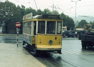 - A Coimbra, la motrice 7 Brill est photographiée à la station « Portagem » communes aux lignes 3 et 4, au mois de juillet 1977. Copyright : Edgar Chaptal