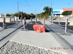 - Plateforme tramway terminée et nouveaux rails posés à la hauteur du passage à niveau de la route de Sète à Saint-Jean-de-Védas. Photo prise le samedi 5 août 2017. Copyright : Anje34