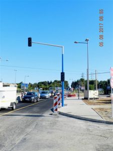 - Signalisation routière classique à feux tricolores installée quelques mètres avant le passage à niveau de la ligne 2, route de Sète à Saint-Jean-de-Védas. Photo prise le samedi 5 août 2017. Copyright : Anje34