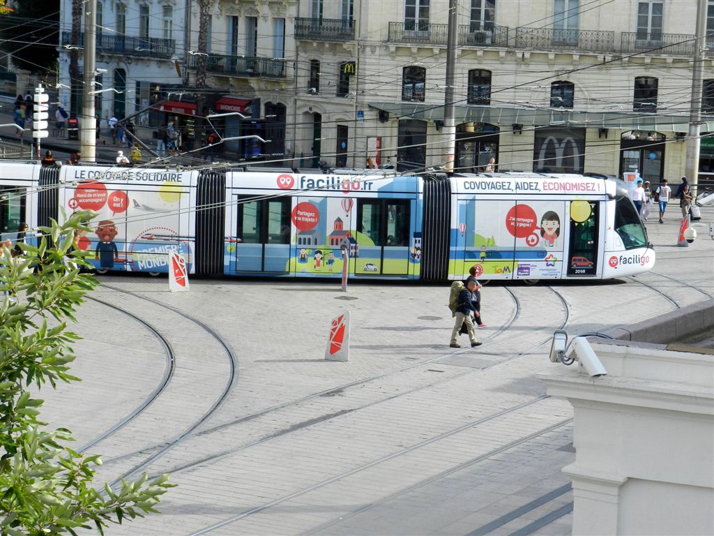 La rame 2098 Citadis 402 Alstom multiligne aux couleurs de la start-up Faciligo est photographiée place Auguste-Gibert à Montpellier, le jeudi 10 août 2017 au matin. Copyright : Anje34
